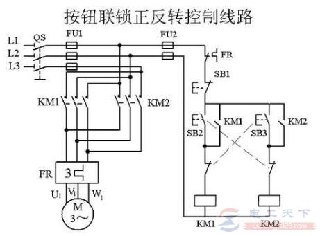 一例接触器双重互锁正反转控制电路图,按钮、按触器双重互锁的正反转控制线路的工作原理,实现正转控制与反转控制,除了用熔断器作短路保护外,还用热继电器作电动机的过载保护。