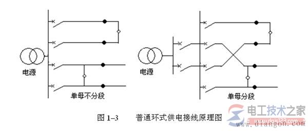普通环式接线是在同一个中压变压器的供电范围内,把不同的两回中压配电线路的末端或中部连接起来构成环式网络,见图1–3。